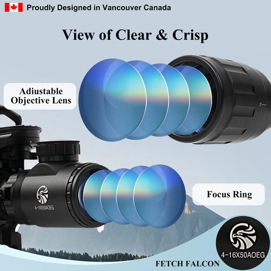 Fetch Falcon 4-16X50 Rifle Scope with Red/Green Reticle and Rangefinder- AOGE Rifle Scopes for Hunting,Airsoft and Pellet Guns,Waterproof and Fog-Proof