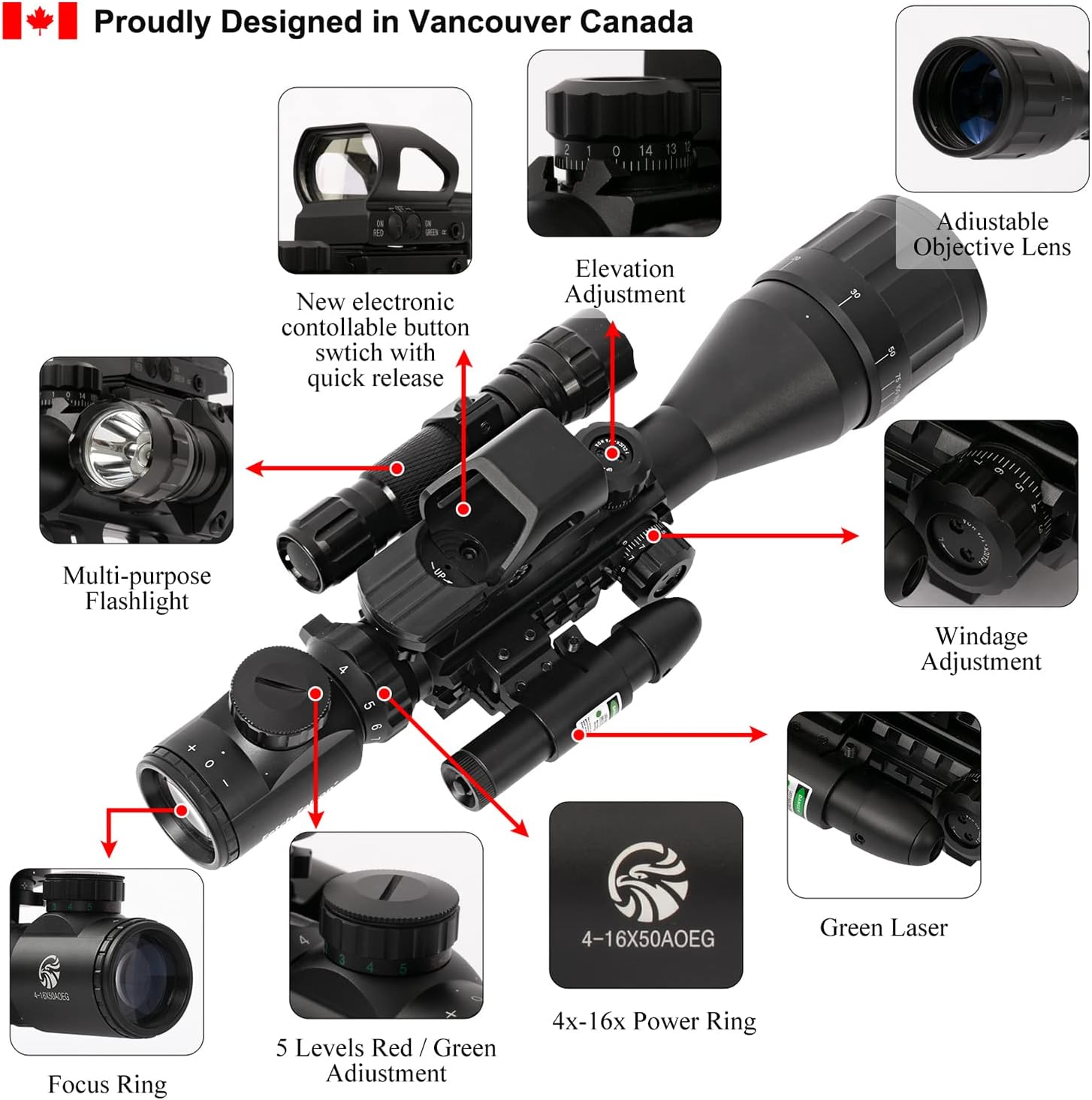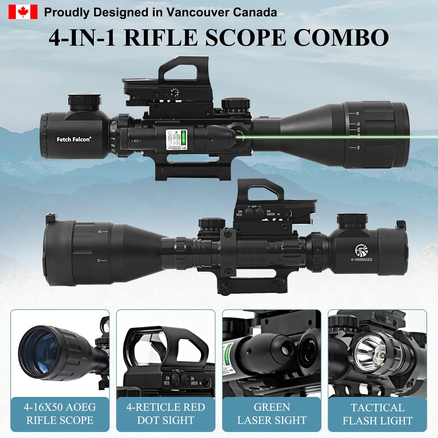 - 4-in-1 Combo: 4-16x50 AOEG Rangefinder rifle scope, holographic reflex sight, green light sighting Scope, and LED tactical flashlight for versatile targeting and illumination.