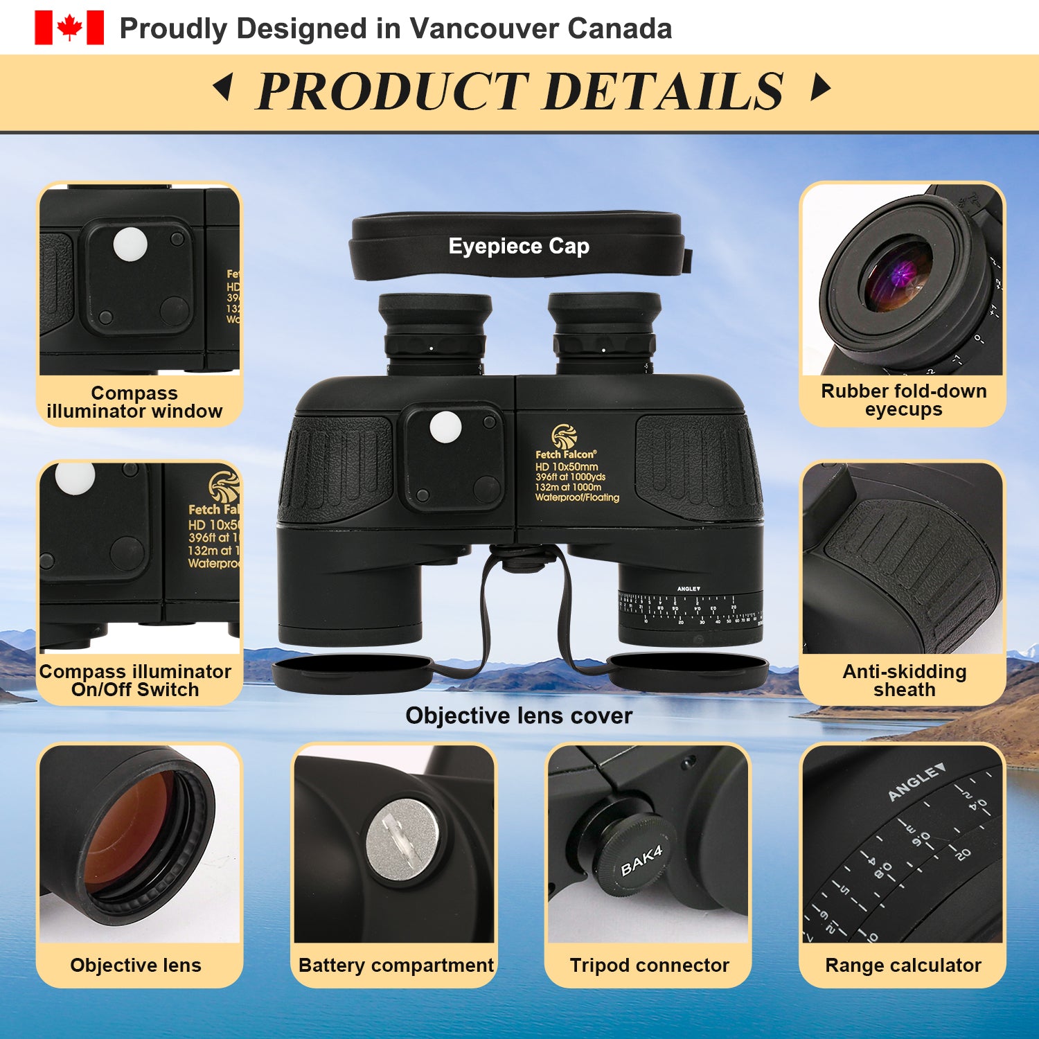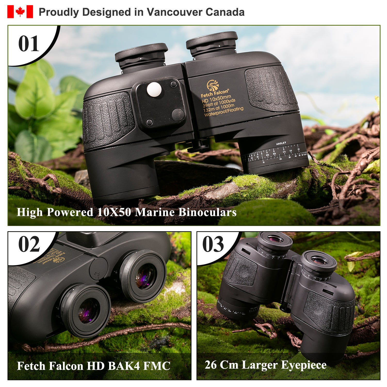 High-Performance Marine Binoculars: Equipped with a 50mm objective lens and built-in reticle readings, calculator dial, illuminator, and compass, these binoculars are perfect for low-light conditions. The integrated rangefinder provides precise distance measurements and object size calculations, enhancing your navigation and observation capabilities for seamless outdoor adventures.