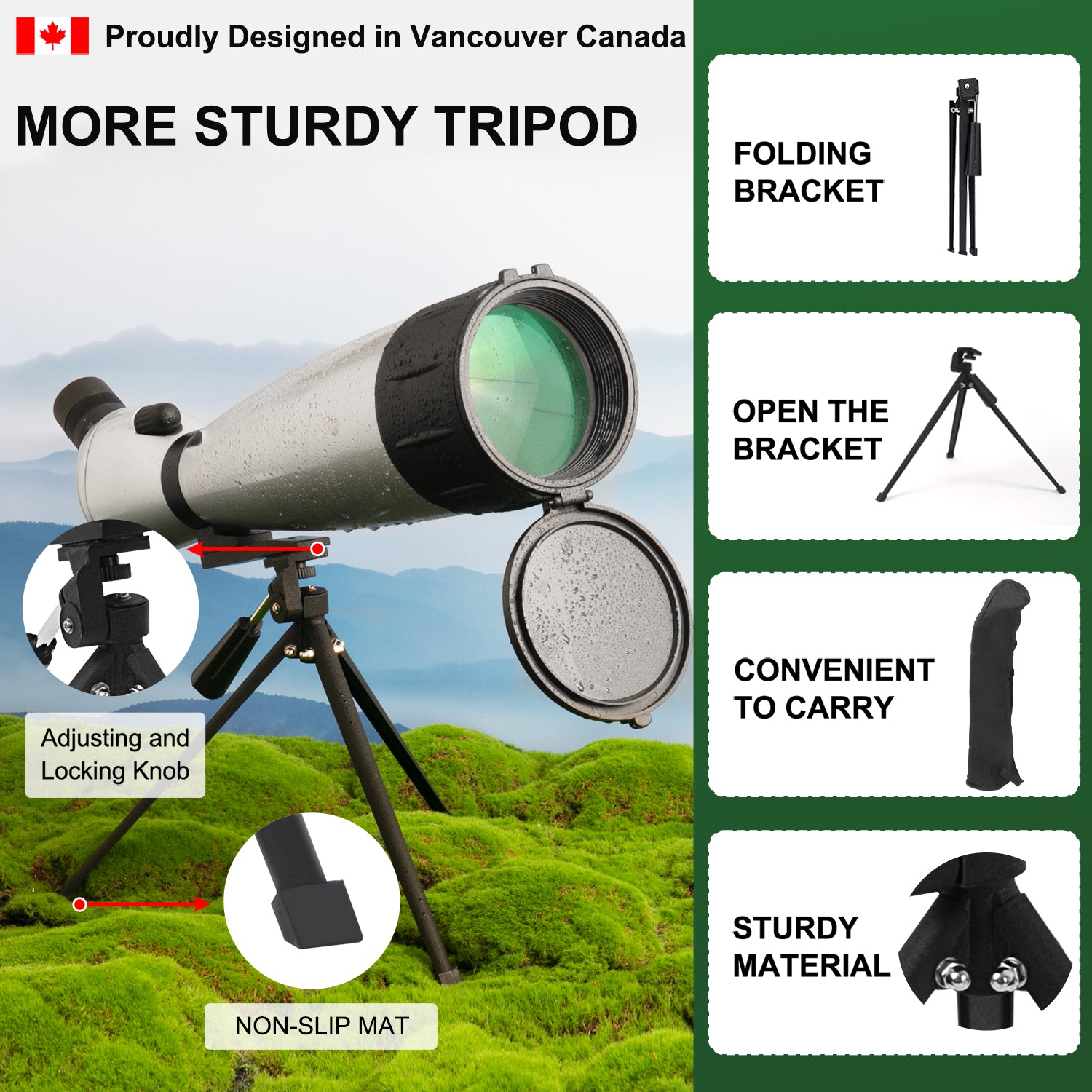 Enhanced Comfort & Convenience: Designed for optimal comfort, this spotting scope includes a metal tripod for stable, hands-free viewing and a phone adapter for capturing images and videos. The included protective carrying case makes it easy to transport and store, ensuring your scope is always ready for your next adventure.